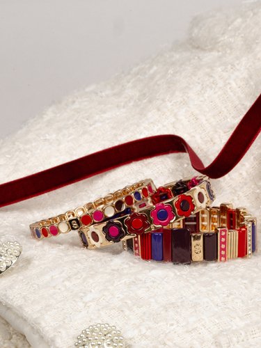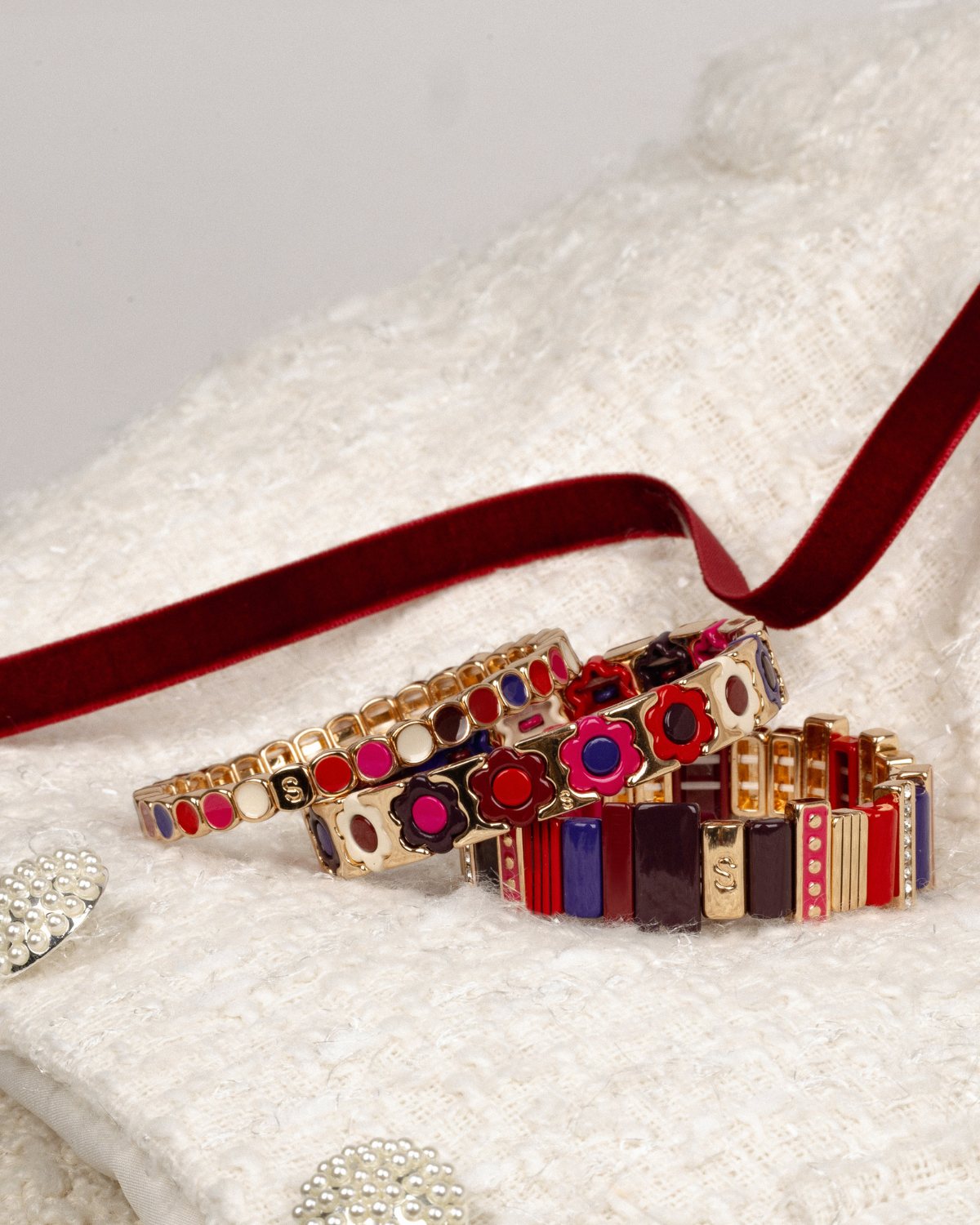 Des bijoux en métal émaillé coloré, soulignés de cristaux étincelants, déploient une palette de rouge profond et de doré lumineux.