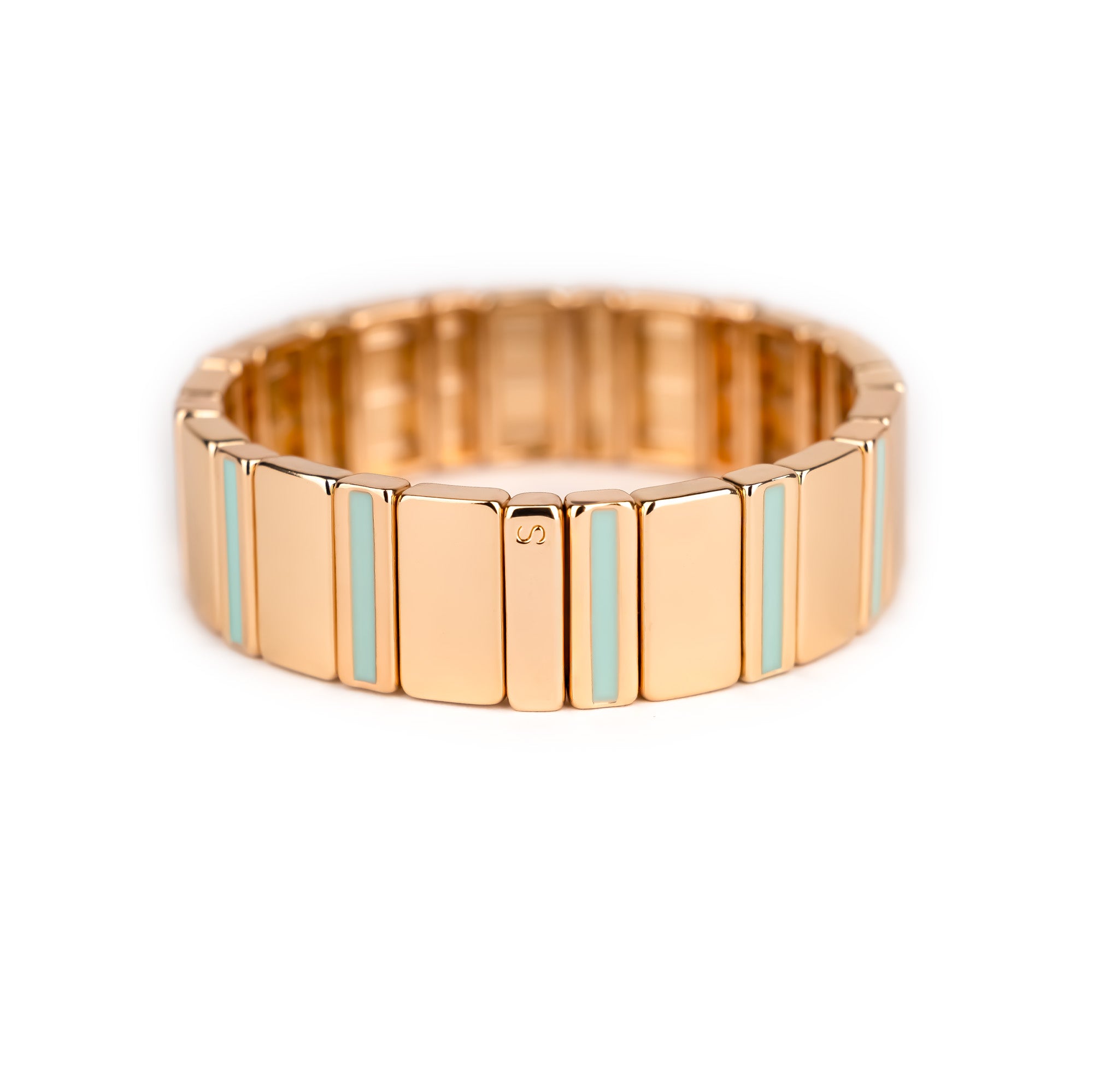 Le bracelet Baguette Gold est un bijou en métal émaillé, composé de fines perles en forme de bâtonnet doré, chacune traversée par un trait coloré vertical qui apporte une touche graphique et élégante au design.