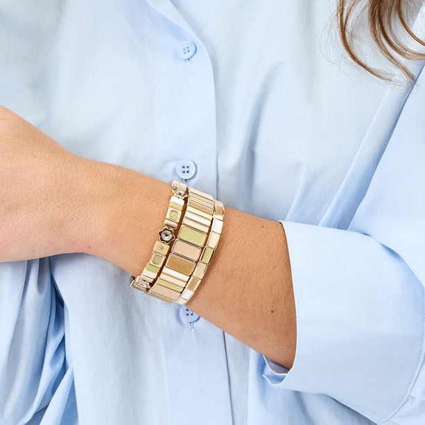 Le bracelet Fin Serti est un bijou en métal émaillé. Il se caractérise par ses petites perles colorées rectangulaires délicatement serties d’un fin contour doré.