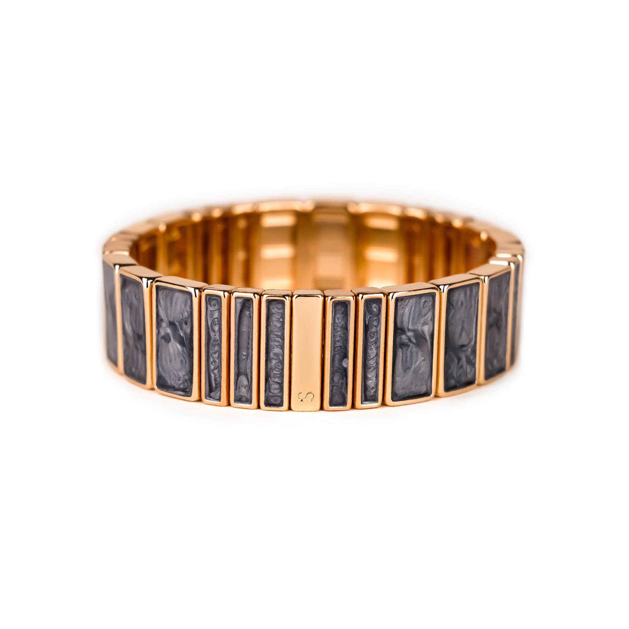 Le bracelet Hubba Maxi Serti est un bijou en métal émaillé. Il se caractérise par ses longues perles colorées rectangulaires soulignées d’un contour serti doré.
