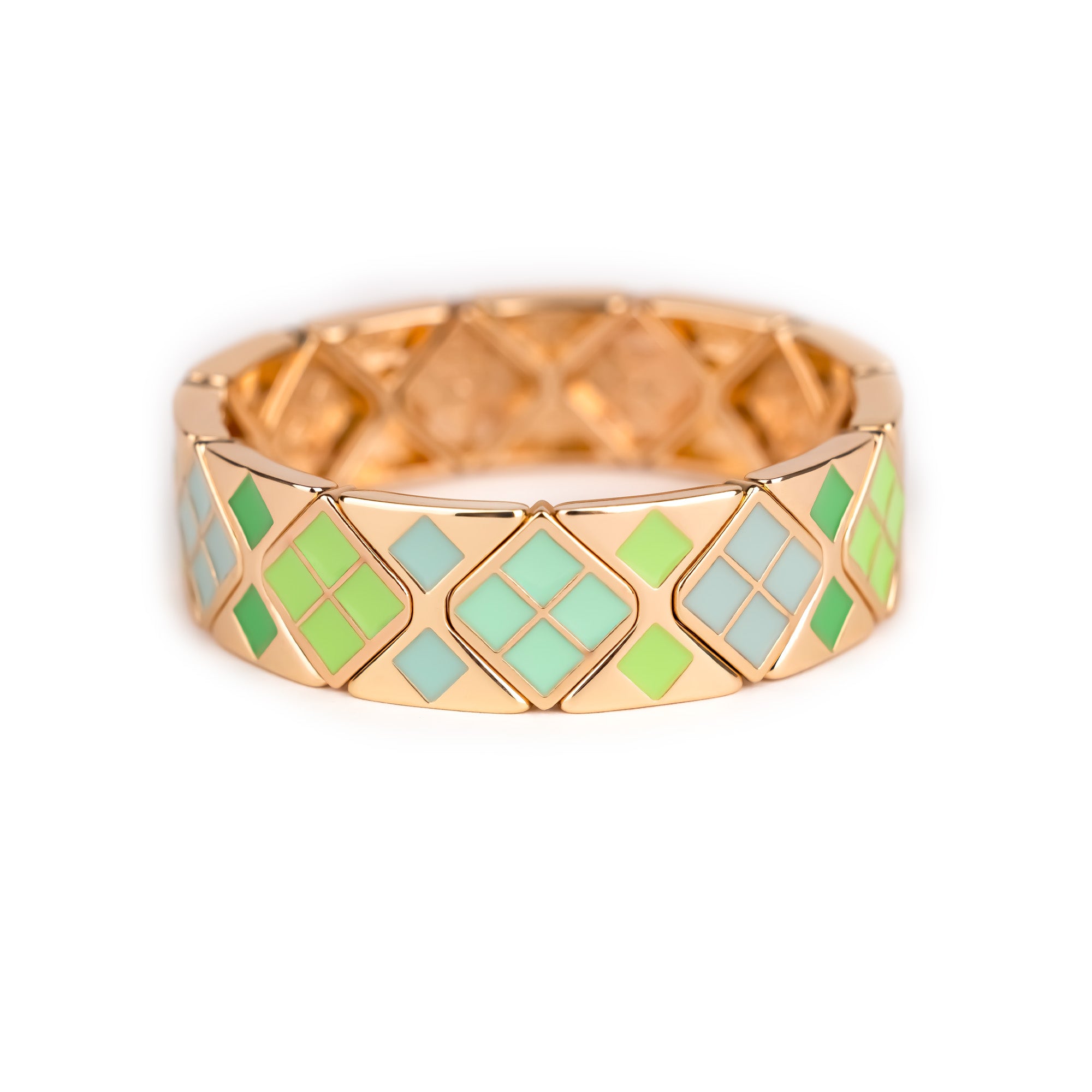 Le bracelet Prism est un bijou en métal émaillé. Il se caractérise par ses perles colorées serties d’une finition dorée à motif de losanges formant une mosaïque graphique.