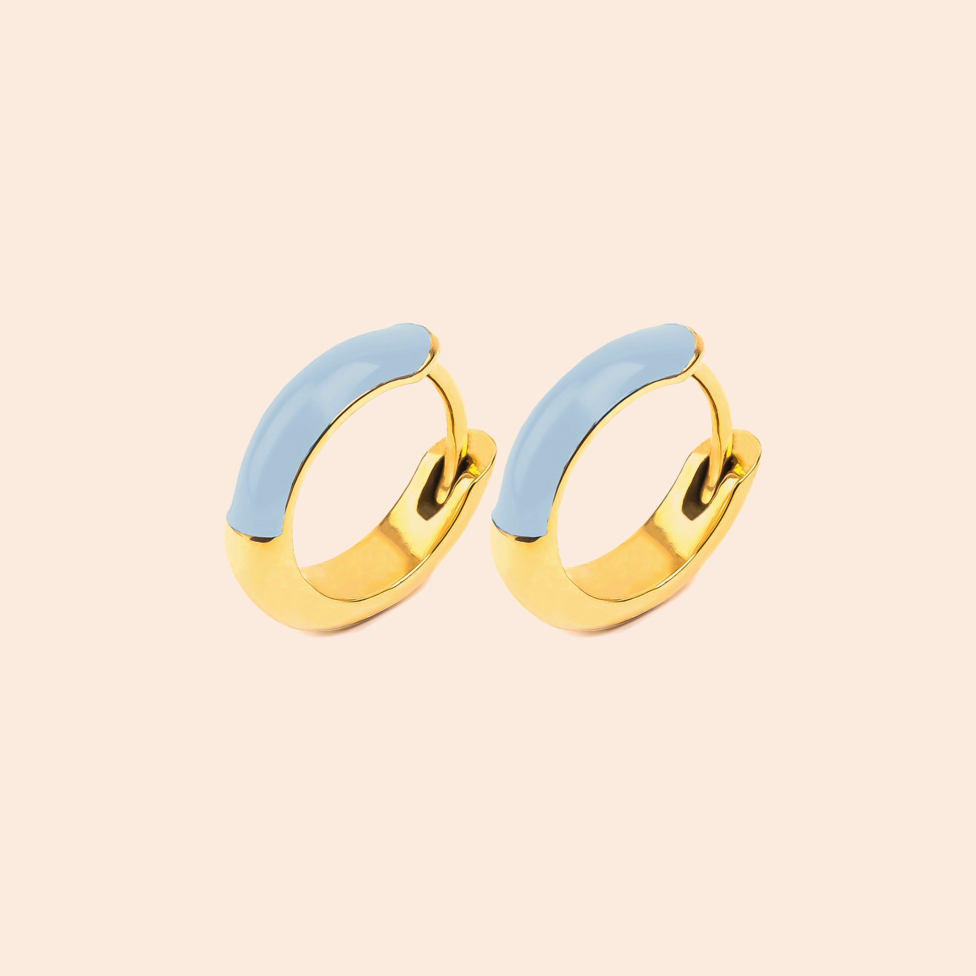 The Les Attachantes earrings are stainless steel jewelry. They are characterized by a thick round hoop with a colored upper part and a gold lower part.
