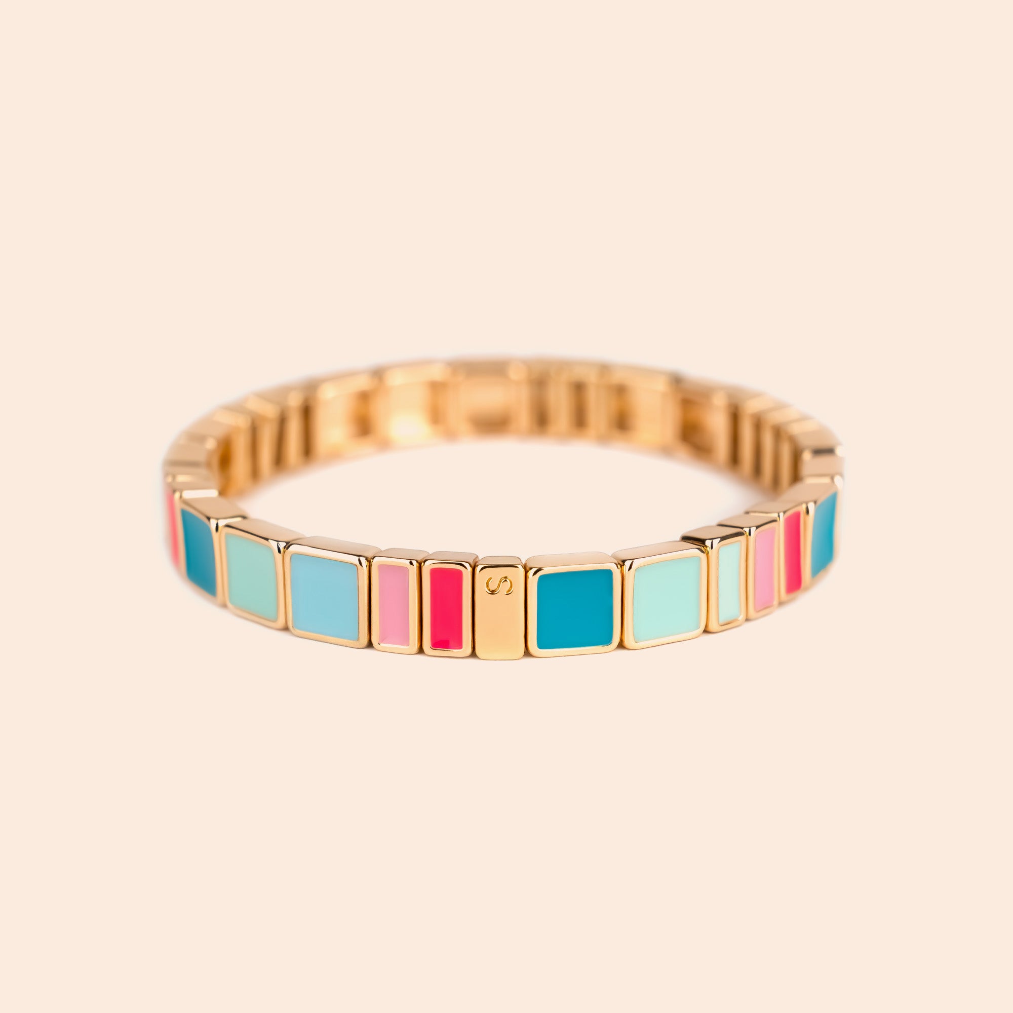 The Hubba Serti bracelet is a piece of jewelry made of enameled metal. It is characterized by its rectangular colored beads delicately set within a gold border.