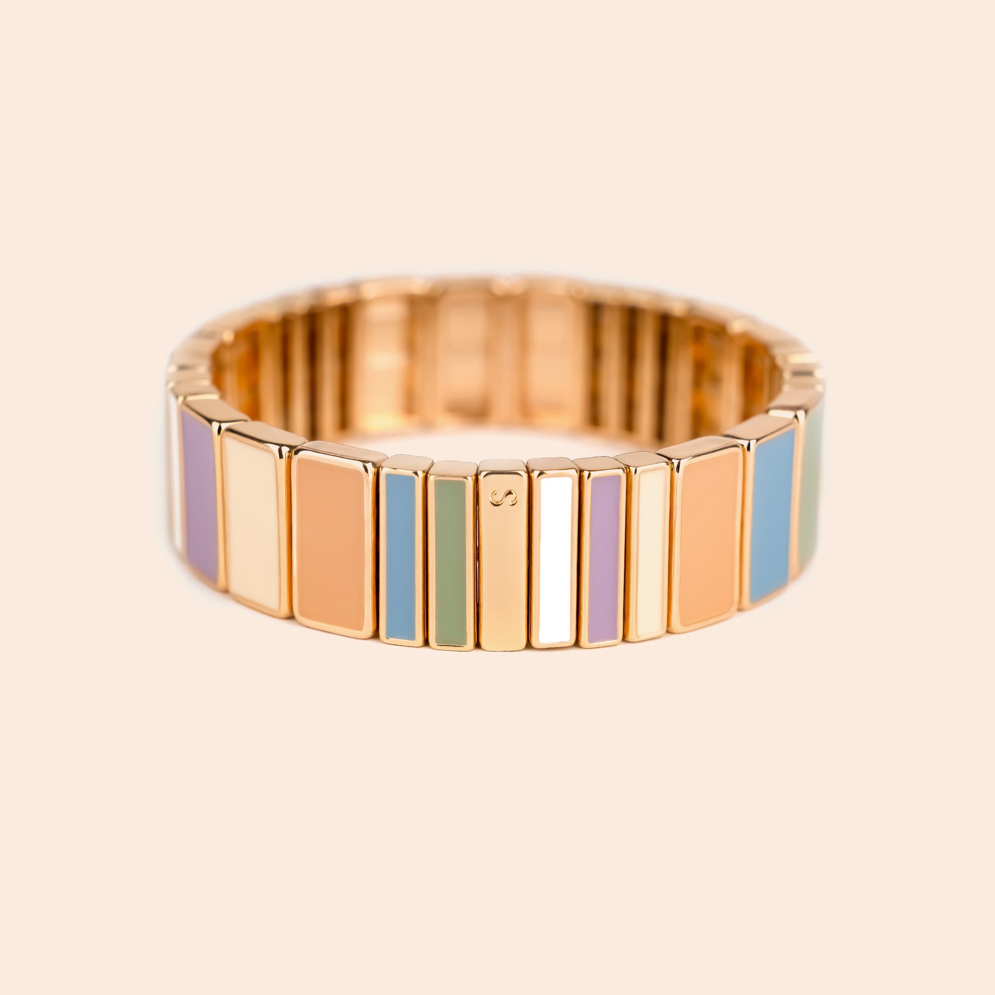 The Hubba Maxi Serti bracelet is a piece of jewelry made of enameled metal. It is characterized by its long, rectangular, colored beads highlighted by a gold-plated border.