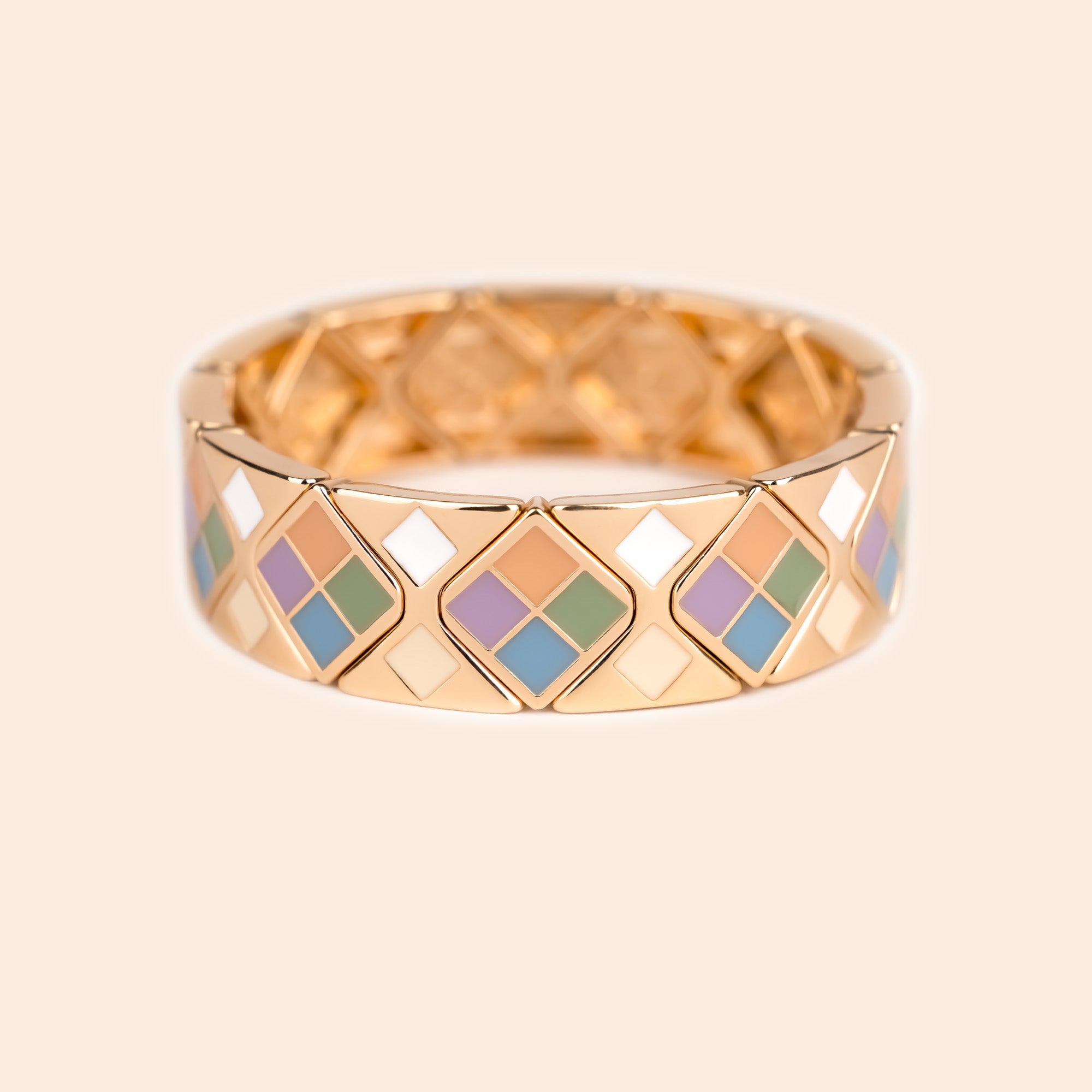 The Prism bracelet is a piece of jewelry made of enameled metal. It is characterized by its colored beads set with a gold finish in a diamond pattern forming a graphic mosaic.