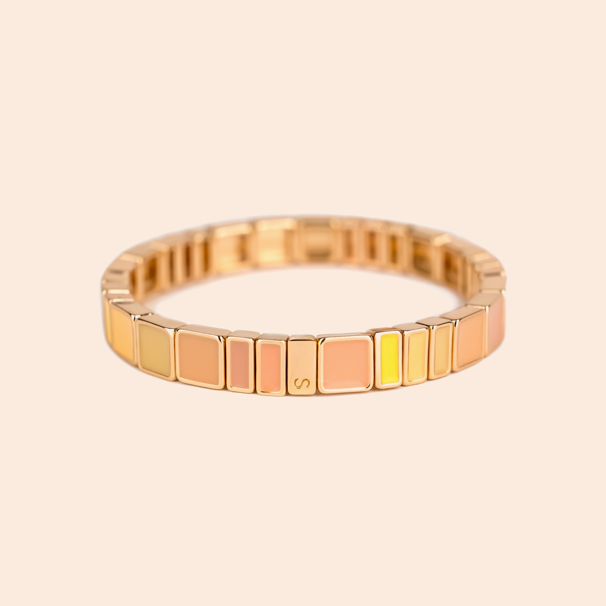 The Hubba Serti bracelet is a piece of jewelry made of enameled metal. It is characterized by its rectangular colored beads delicately set within a gold border.