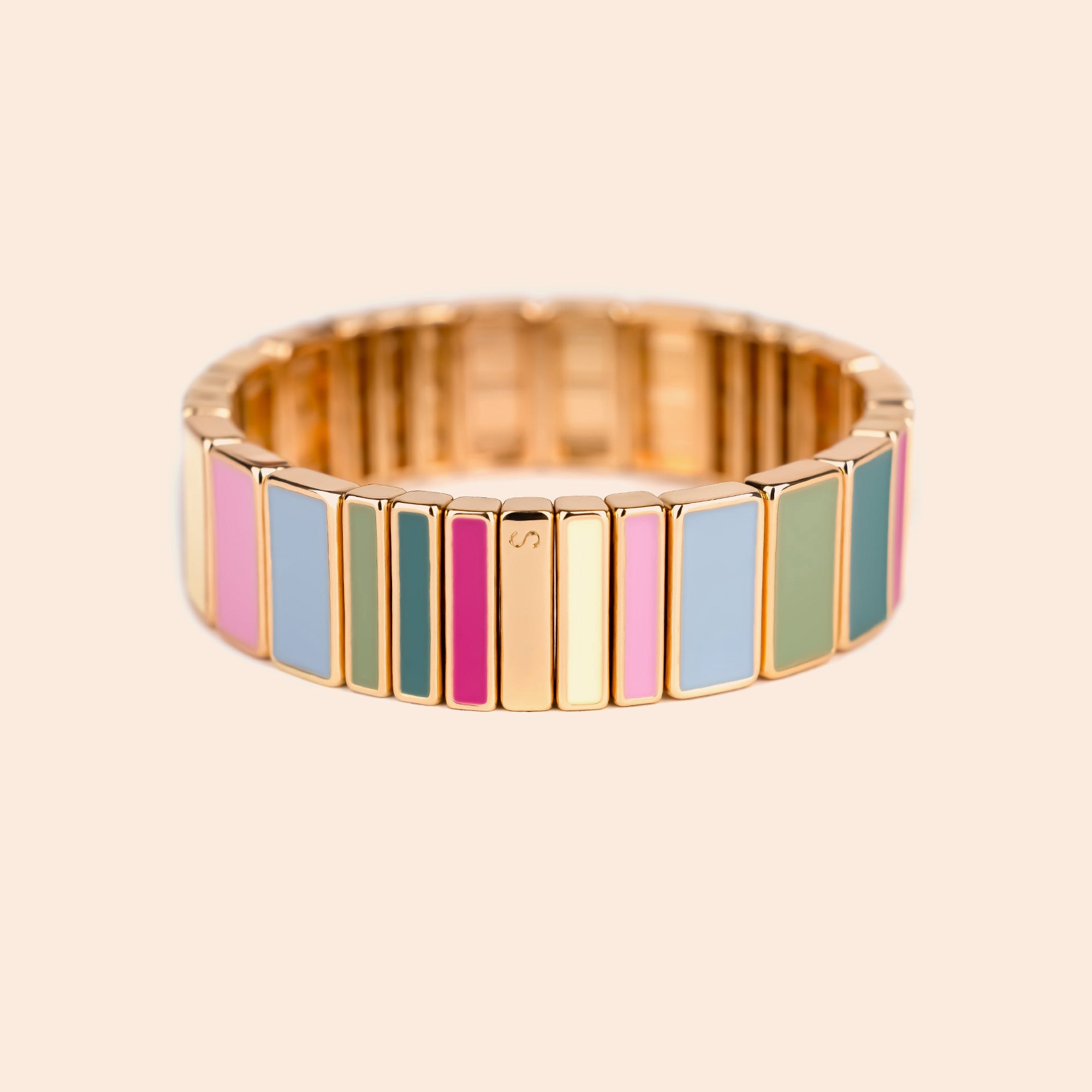 The Hubba Maxi Serti bracelet is a piece of jewelry made of enameled metal. It is characterized by its long, rectangular, colored beads highlighted by a gold-plated border.