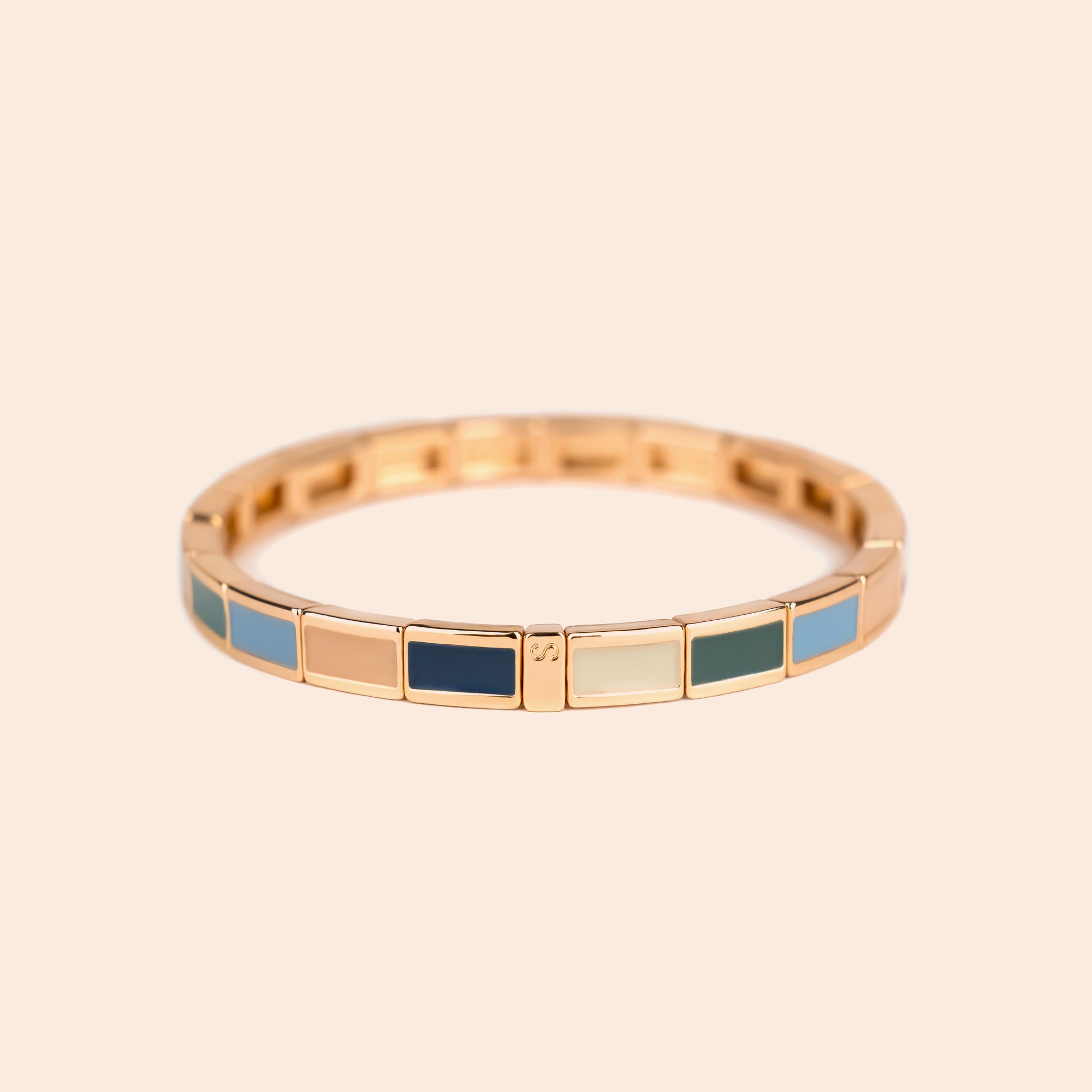 The Fin Serti bracelet is a piece of jewelry made of enameled metal. It is characterized by its small, rectangular, colored beads delicately set within a thin gold border.